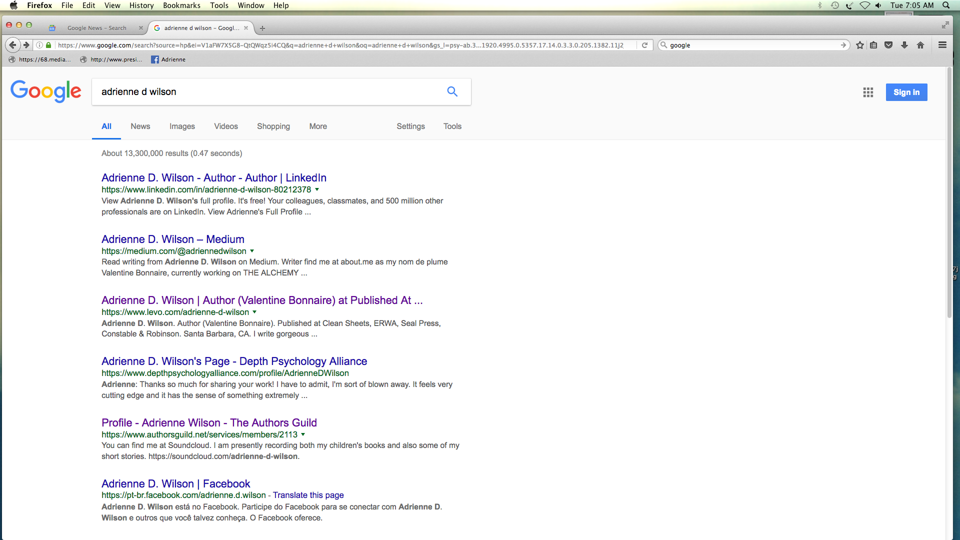 I've been blogging at WP since 2007 as Valentine Bonnaire, but that was a nom de plume. I'm a writer. June is Santa Barbara Writers Conference. You can find me here and in Facebook. That was an old gravatar from my WP blog Valentine Bonnaire - and this is my new one. Really loving the new version of WordPress as Premium. Learning this one first before I move to the Business version. Nice to meet you! Facebook: https://www.facebook.com/adrienne.d.wilson View all posts by Adrienne