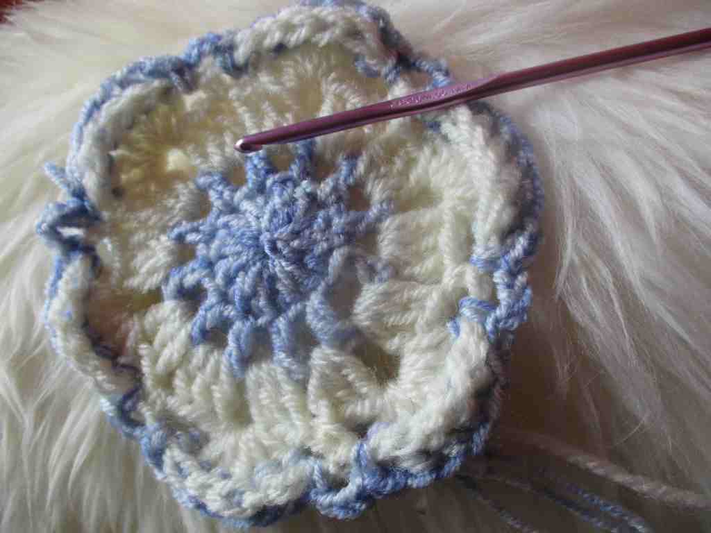 Row 12 – Picot edge – join in any single crochet after petal, SC, in next stitch 2 HDCS, next stitch 3 DCs, picot at center DC, in same stitch. 2 HDC’s 1 SC, FPSC around petal. Repeat around. 16 times.