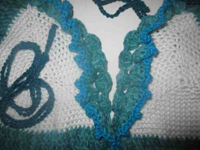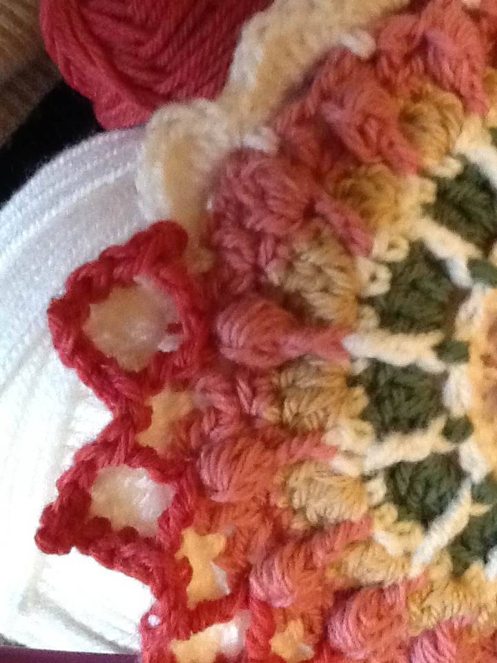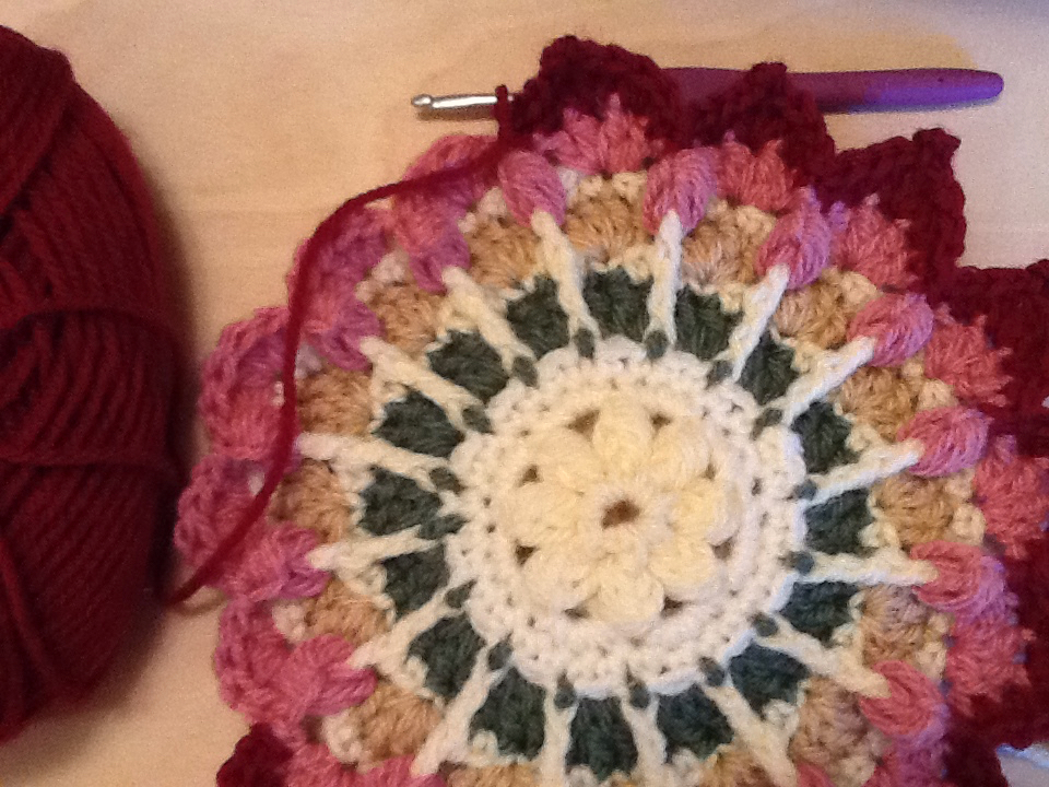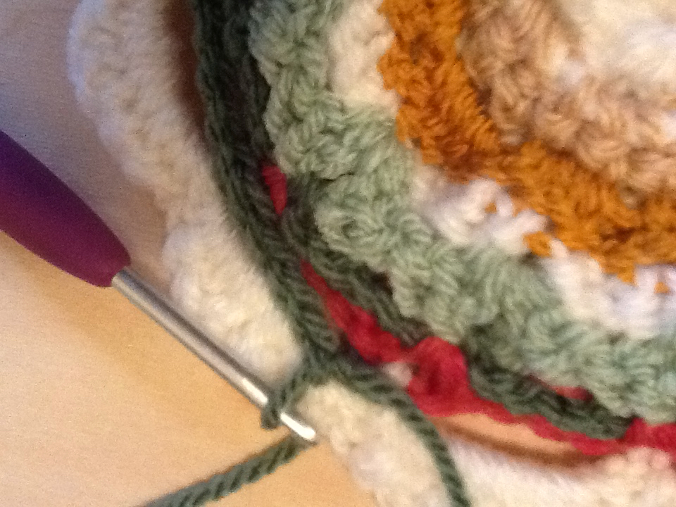 Row 7 – 3 DC’s into each chain three space from previous round, chain one between each group. (12 or 13 groups of 3 DC’s)