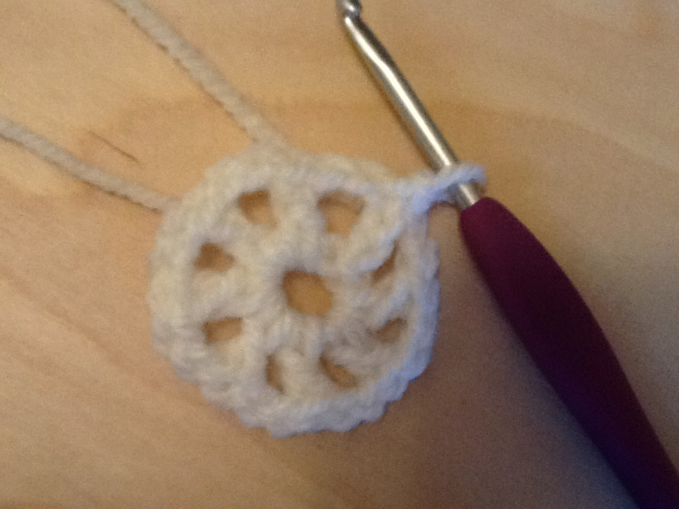 Row 2 – chain 5 (acts as first DC, chain 2) 7 more DC chain 2’s in ring, gives you 8 spokes. Slip stitch to close.
