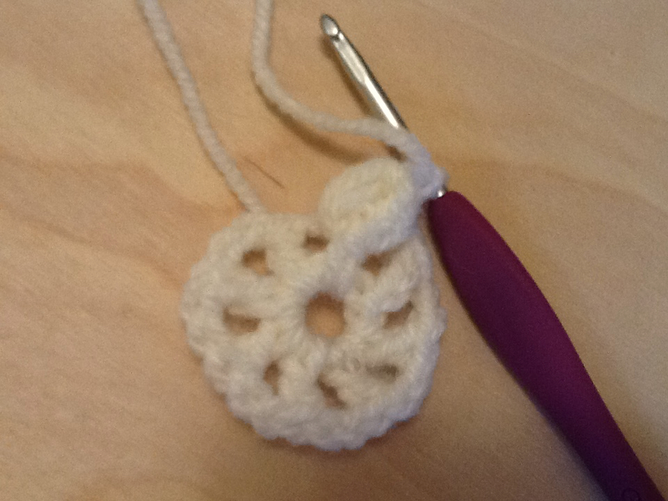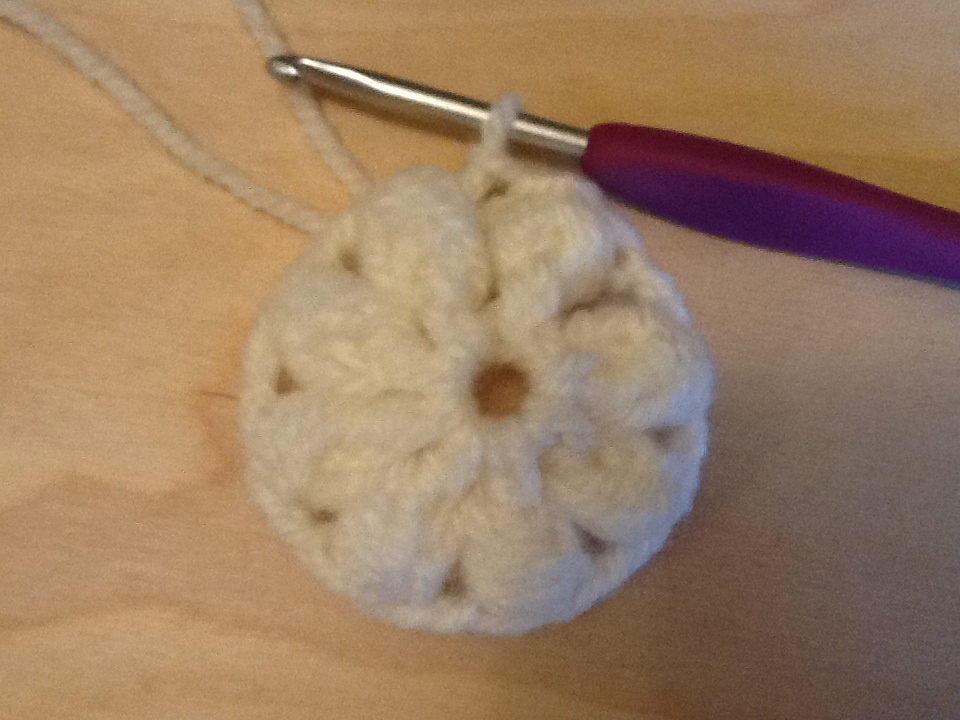 Row 3 – around each DC, yarn over and pull up a loop 4 times, chain one to close, chain one. Repeat until each spoke has a petal top. Slip stitch to close. (8 petals, 8 chain one spaces)