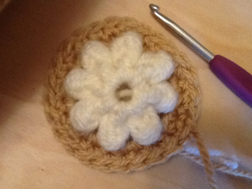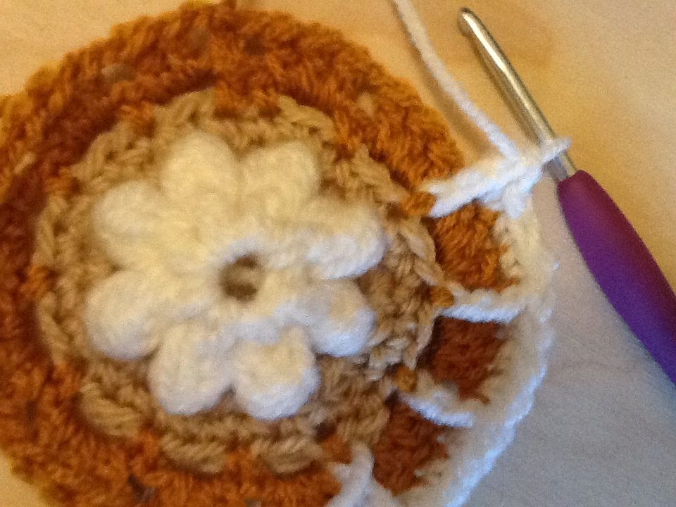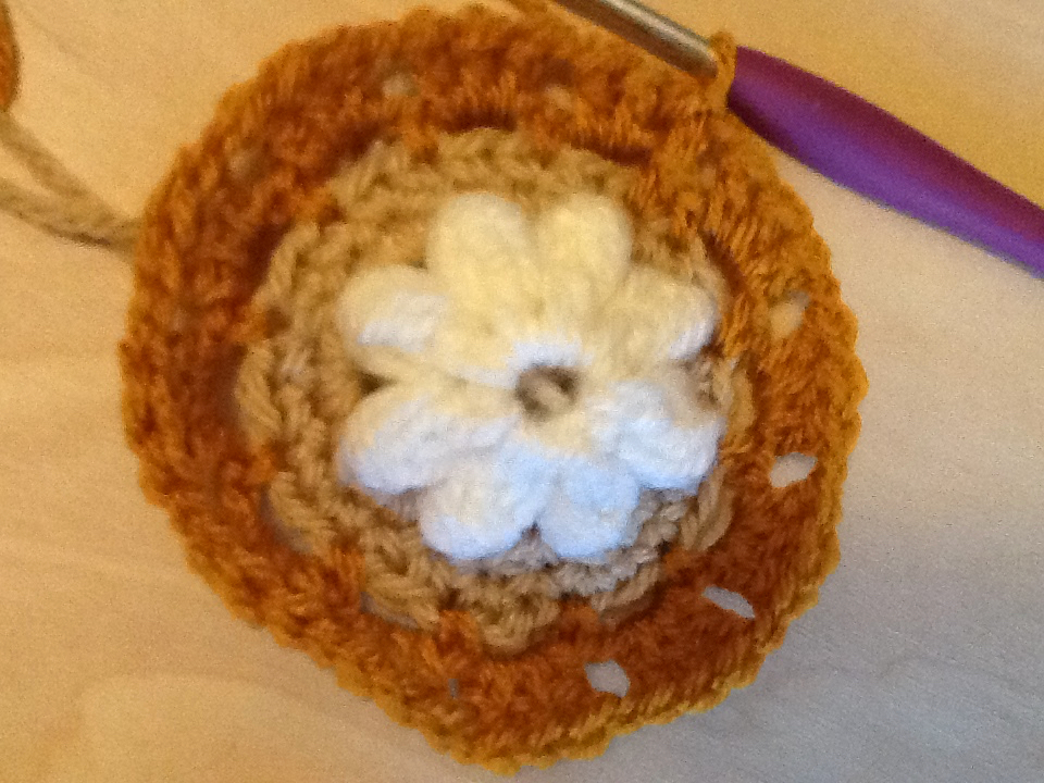 Row 4 – add new color, in any SC space, two SC’s, FPSC around each flower petal. Repeat 7 times. Slip stitch into first SC to close. (16 SC’s 8 FPSC)