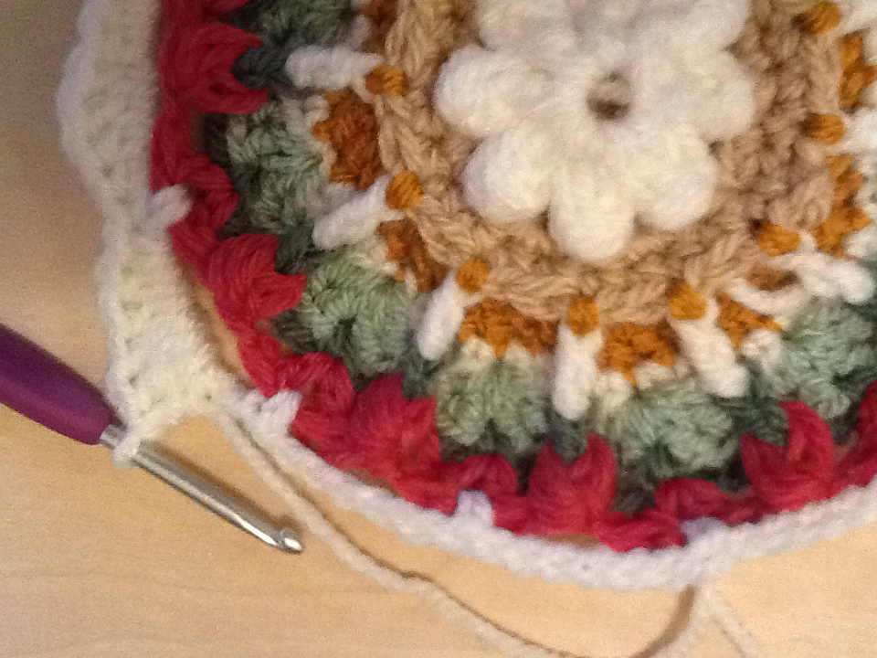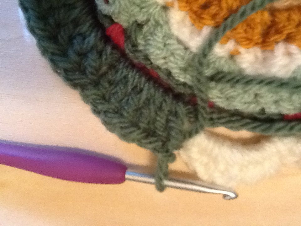 For small square – use strips of yarn to mark for corners, each group of three 6 DC’s. 2 DCs 1 SC, 2 DC’s – FPHDC in all stiches until next corner. Repeat around.