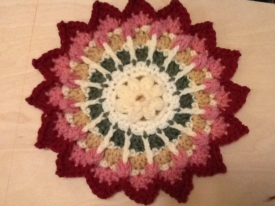 Row 11 — Join new color, SC around any DC spoke, proceed to make petals, as you did in round three –yarn over 4 times, close with chain 1, in next SC space atop DC clusters, make DC chain one DC. Repeat around — 12 petals, 12 V stitches.