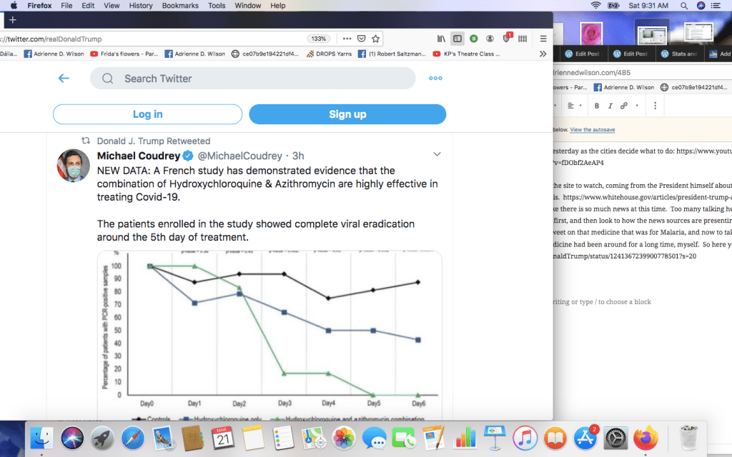 This is fantastic news – I got this from the President’s tweets on that Malaria drug <blockquote class="twitter-tweet"><p lang="en" dir="ltr">NEW DATA: A French study has demonstrated evidence that the combination of Hydroxychloroquine &amp; Azithromycin are highly effective in treating Covid-19.<br><br>The patients enrolled in the study showed complete viral eradication around the 5th day of treatment. <a href="https://t.co/WnGs5PKOpn">https://t.co/WnGs5PKOpn</a> <a href="https://t.co/JZzZ66w4rL">pic.twitter.com/JZzZ66w4rL</a></p>&mdash; Michael Coudrey (@MichaelCoudrey) <a href="https://twitter.com/MichaelCoudrey/status/1241354642417577986?ref_src=twsrc%5Etfw">March 21, 2020</a></blockquote> https://platform.twitter.com/widgets.js