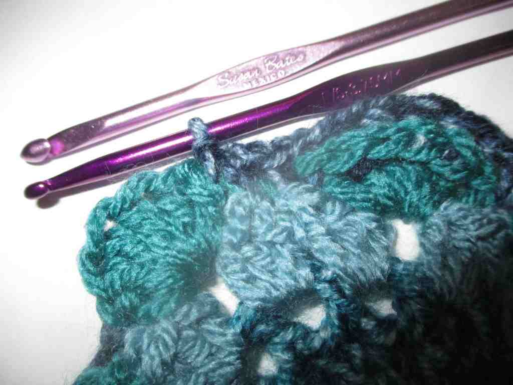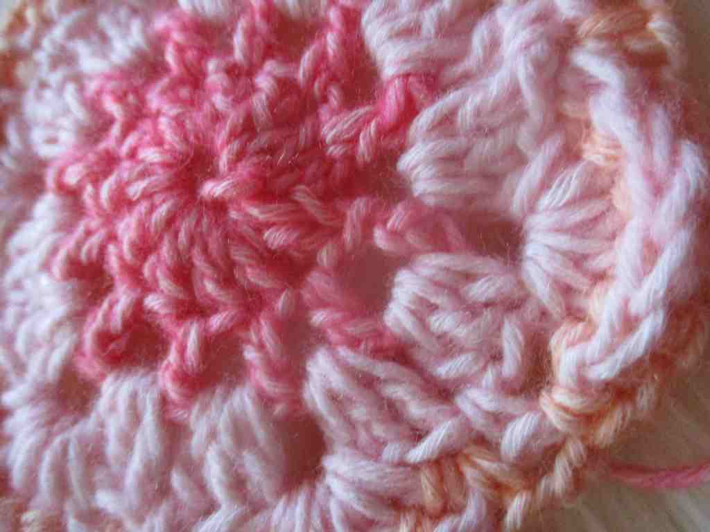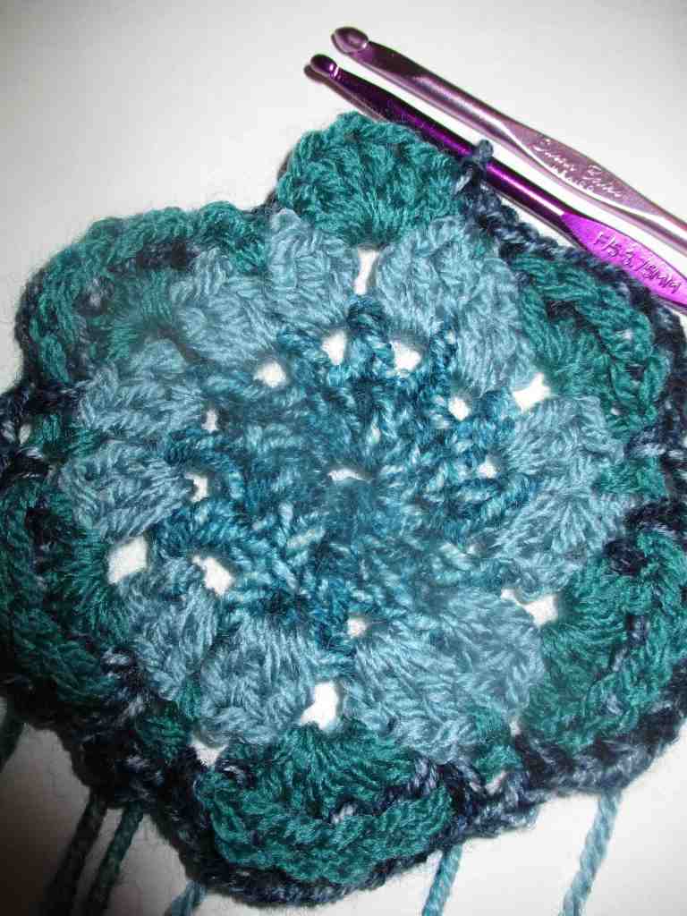 For small square – use strips of yarn to mark for corners, each group of three 6 DC’s. 2 DCs 1 SC, 2 DC’s – FPHDC in all stiches until next corner. Repeat around.
